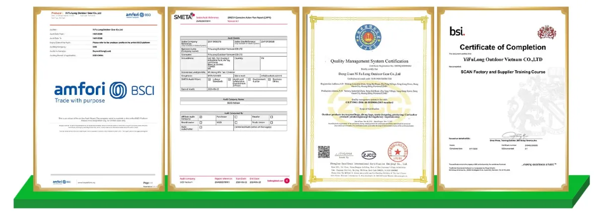 Сукцесивно смо стекли низ ауторитативних сертификата, укључујући ИСО 9001 за управљање квалитетом, БСЦИ/СМЕТА за друштвену одговорност и Хигов индекс за одрживост животне средине.